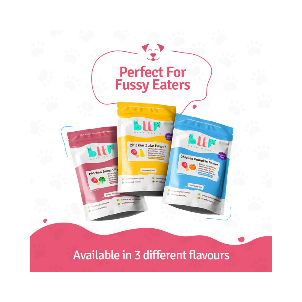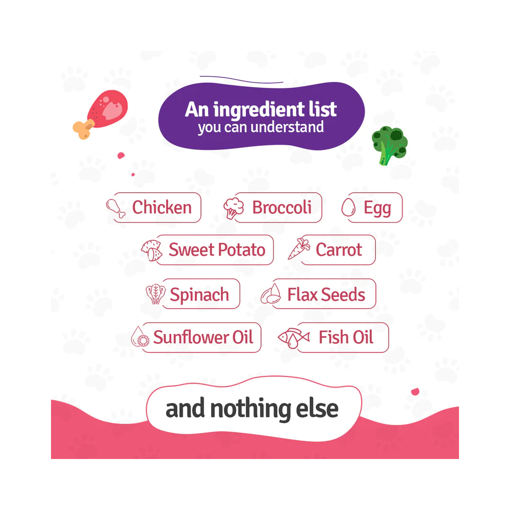 100% Natural & Fresh Dog Food, vet-formulated, human-grade food made with Chicken, Broccoli, Egg, Sweet Potato, Carrot, Spinach, Flax Seeds, Cold pressed Sunflower Oil, Fish Oil and nothing else. Our food contains No Preservatives, Chemicals, Additives & Sugar.