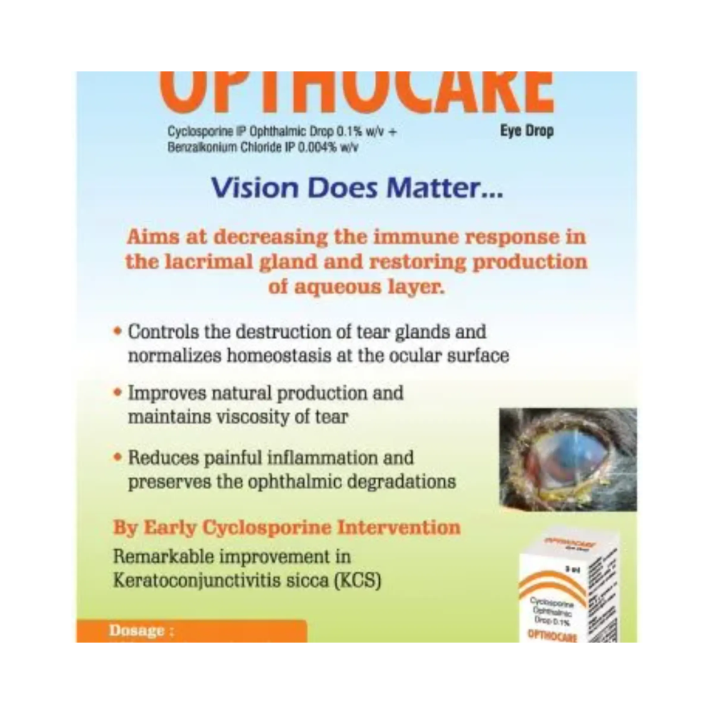 Opthocare eye drops contain cyclosporine which is an immunosuppressant. It helps in decreasing the immune response in the lacrimal gland and restoring production of aqueous layer. By Early Cyclosporine intervention Remarkable improvement in Keratoconjunctivitis sicca (KCS) can be seen and an early KCS detection helps vision protection. Mechanism of action of cyclosporine is based on t-lymphocyte inhibition.Opthocare eye drops contain 1 % cyclosporine. It controls the destruction of the tear gland and normalises homeostasis at the ocular surface. By early intervention in the cases of KCS remarkable improvement can be seen. Mechanism of action of cyclosporine is based on t-lymphocyte inhibition.