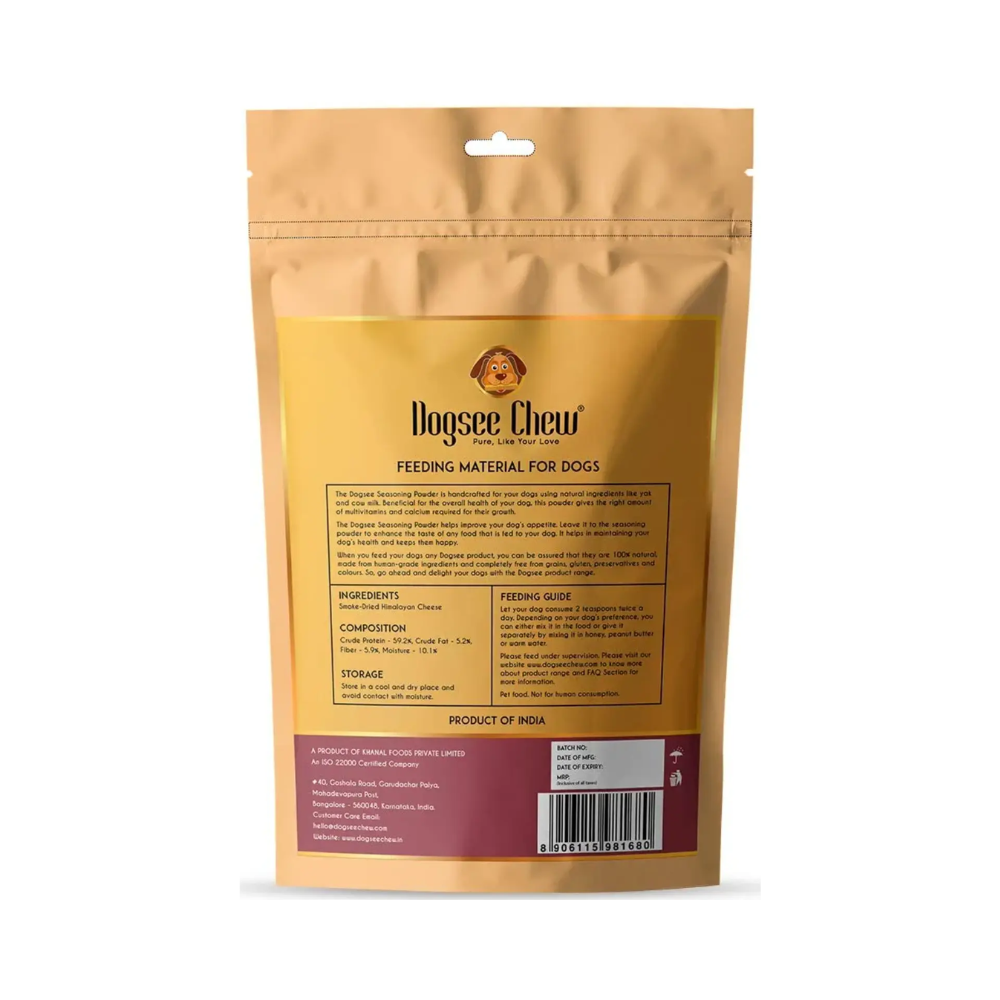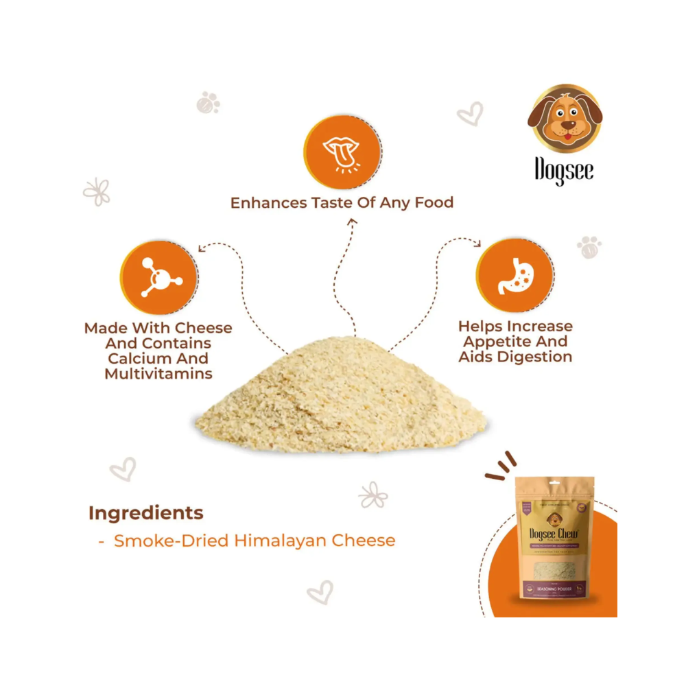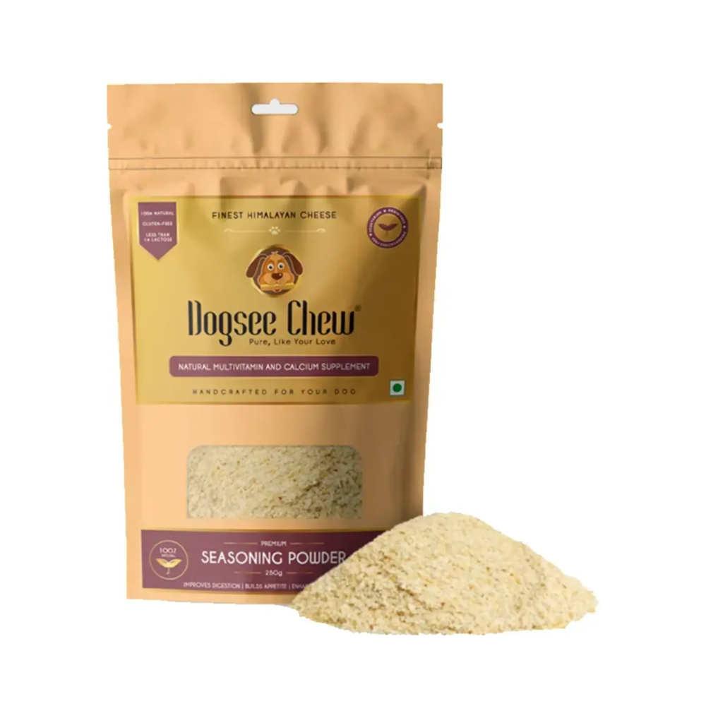 Dogsee Chew Multivitamin Seasoning Powder is a completely natural supplement to provide dogs with essential vitamins and minerals. This seasoning powder stimulates appetite and promotes general growth, making it the ideal dog food seasoning. It contains fine Himalayan cheese, which helps to keep all aged dogs in good health while making them happy! Including calcium and multi-vitamin supplements, this dog food enhancer will assist with the overall development and growth of your canine. Give them the top-notch dog food seasoning they deserve -Dogsee Seasoning Powder.