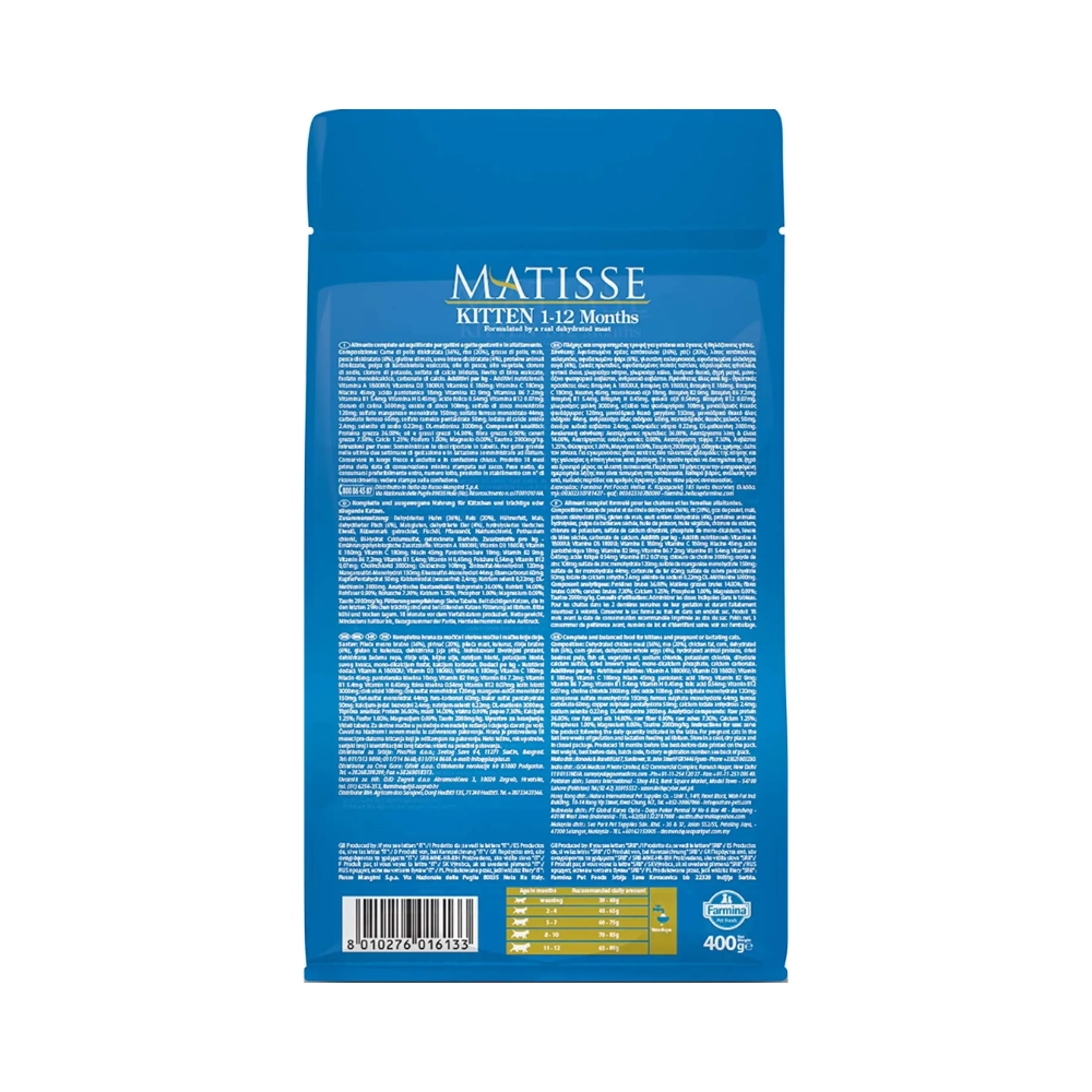 Farmina Matisse Premium Kitten Food offers complete nutrition to fuel a healthy and balanced growth. Finest quality ingredients, including the best quality real dehydrated meat, have been put together to supply a highly digestible food for kittens. With high and right amounts of calorie and protein, the wholesome diet can also be fed to meet the nutritional needs of pregnant and lactating bitches. Vitamins and minerals further add to the nutritional richness of the cat food. Matisse kitten promotes healthy development of brain and also boosts the health of heart. Immune system gets support to fight off the infection causing foreign organisms. Balanced proportions of omega-3 and omega-6 enhance the beauty and softness of fur.