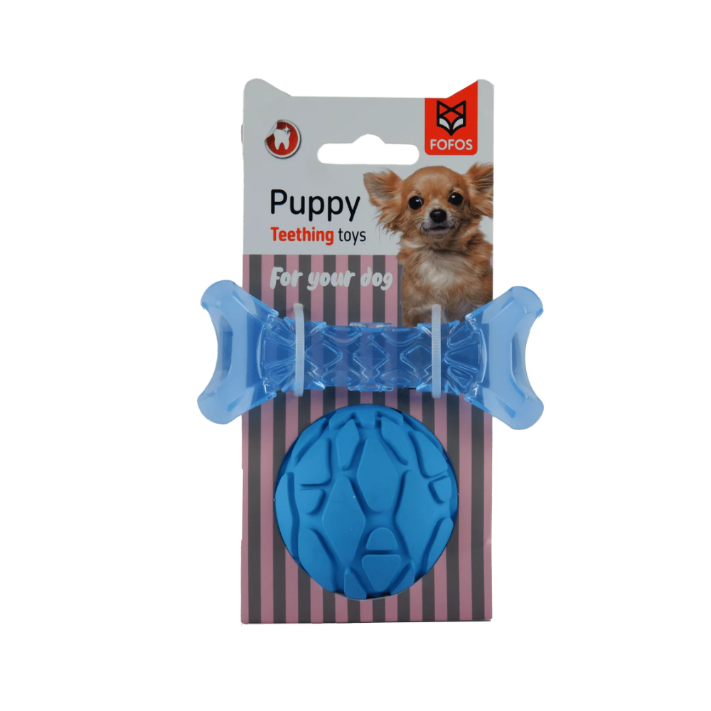 Fofos milk bone and ball is a set of dog toys that have a bumpy texture to soothe teething while being gentle on gums. This set of teething toys include a bone and a ball with a squeaker inside that gives rise to a squeaky noise when your pet interacts with it. This toy is made from a combination of 100% natural rubber and TPR. The squeaker inside the ball toy makes playtime engaging for your pet. Interactive dog toys such as this allow your dog to chew, fetch, and bite on them while getting the right amount of exercise. This toy is ideal for small-medium puppies (5-20kg) of various breeds such as dachshund, pom, spitz, Shih Tzu, pug, beagle, labrador, etc above 2 months of age. Teething toys are soft and designed specifically to help soothe teething pain in puppies’ gums. It is a set of strong but not indestructible toys and is best suited for pet dogs that are teething, and have a chew and fetch playing style. Not recommended for dogs with adult teeth or aggressive chewers.