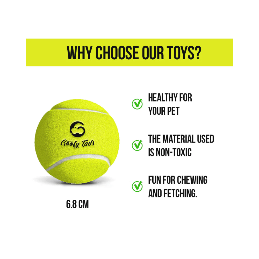 Goofy Tails dog tennis ball is the perfect all-breed dog. The dog ball encourages your dog to run, fetch, and exercise, keeping them happy and healthy. The dog toy balls are made from resilient non-toxic material, so it is safe for your dog. This Solid Ball is a classic design that belongs in every dog’s toy box. Its size is perfect for tossing long distances. We recommend supervising your pet during playtime.