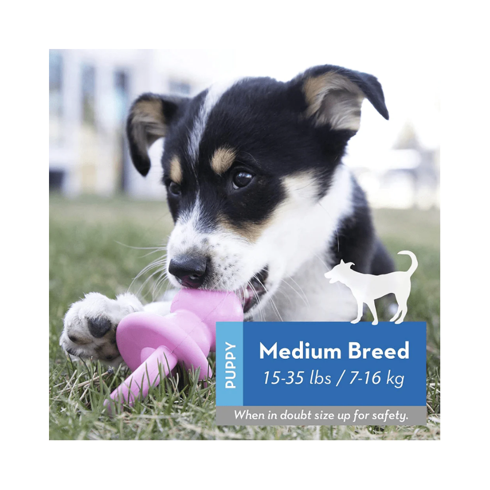The Binkie from KONG is designed for teething pups. It is made with soft rubber that soothes a pup’s sore gums as they gnaw on it. The centre of this toy can be filled with puppy treats for an interactive game. This toy promotes appropriate chewing behaviour.