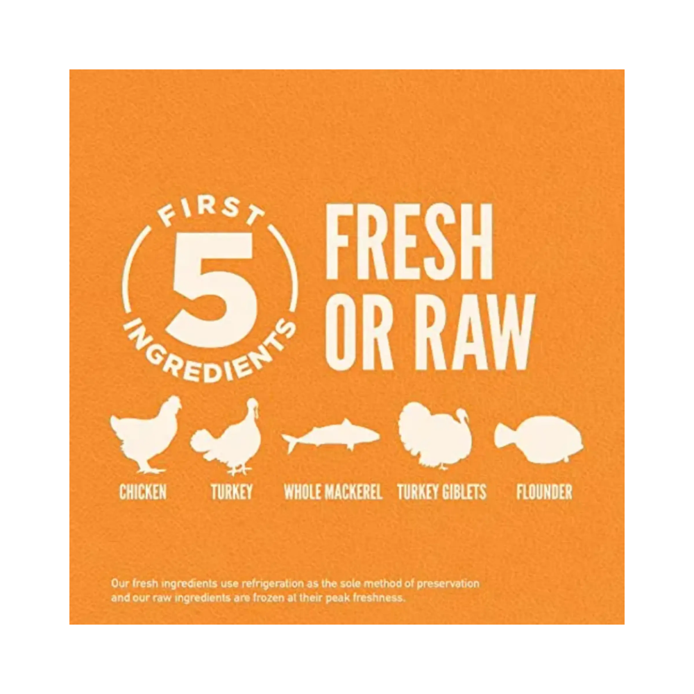 Deboned chicken, deboned turkey, whole eggs, atlantic flounder, whole atlantic mackerel, chicken liver, turkey liver, whole atlantic herring, chicken heart, turkey heart, dehydrated chicken, dehydrated turkey, dehydrated mackerel, dehydrated chicken liver, dehydrated egg, whole red lentils, whole pinto beans, chicken fat, chicken necks, chicken kidney, whole green peas, whole green lentils, whole navy beans, whole chickpeas, natural chicken flavor, pollock oil, ground chicken bone, chicken cartilage, lentil fiber, choline chloride, whole pumpkin, whole butternut squash, mixed tocopherols (preservative), dried kelp, zinc proteinate, freeze-dried chicken liver, kale, spinach, mustard greens, collard greens, turnip greens, whole carrots, apple