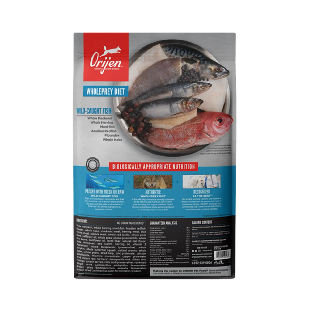 Orijen Six Fish Dog Food is a complete meal designed to meet the high energy requirements in dogs of all life stages. With 38% richly nourishing protein, and limited 18% low-glycemic carbohydrates, ORIJEN SIX FISH nurtures dogs of all life stages according to their evolutionary and biological needs. Unparalleled by any other dog food, 2/3 of Orijenï½s fish are FRESH (refrigerated, without preservatives) or RAW (flash-frozen, without preservatives), including the top 6 fish ingredients.1/3 of fish are mildly dried at 90½C from fresh whole fish to create a concentrated source of richly nourishing protein that cannot be supplied by fresh fish alone. Nutrient-dense WholePrey ratios of fresh whole fish (including meat, organs, and bones) provide virtually every nutrient your dog needs to thrive ï½ only zinc and copper are added. Infusions of freeze-dried cod liver promotes flavor naturally, making ORIJEN deliciously tasty, even for fussy eaters.