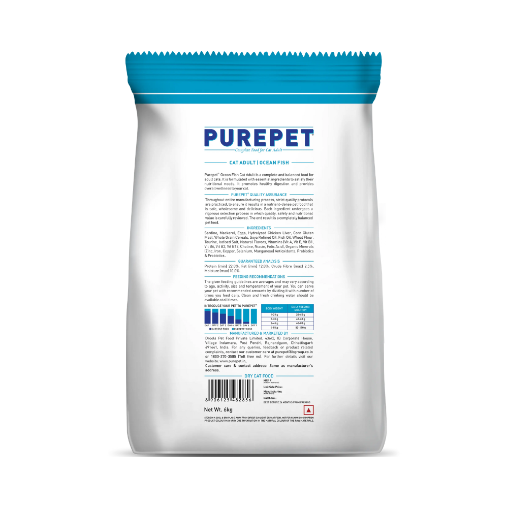 DROOLS Purepet Ocean Fish Adult Dry Cat Food offers all the vital nutrients and minerals from Real Sardine and Mackerel fishes which fulfils all the dietary requirements of adult cats of all breeds. A healthy protein content from the ocean fishes enhances muscle mass and strength. Essential vitamins and minerals keep a healthy urinary tract and supports optimum urine pH level. Organic fibres from whole grain cereals helps to obstruct hairball formation which is prevalent in adult cats. Having natural prebiotics and probiotics in the diet gives healthy gut bacteria for boosting the digestive mechanism. Above all, DROOLS Pure Pet Cat Adult Ocean Fish has important fatty acids like Omega 3 and Omega 6 that eliminates skin allergies and regulates good brain functioning in adult felines.