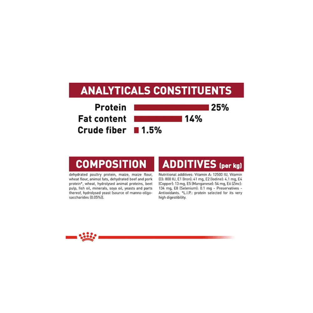 COMPOSITION: Dehydrated poultry protein, maize, maize flour, wheat flour, animal fats, wheat, hydrolyzed animal proteins, beet pulp, fish oil, soya oil, yeasts and parts thereof, minerals, hydrolyzed yeast (source of manno-oligo-saccharides (0.05%)).
