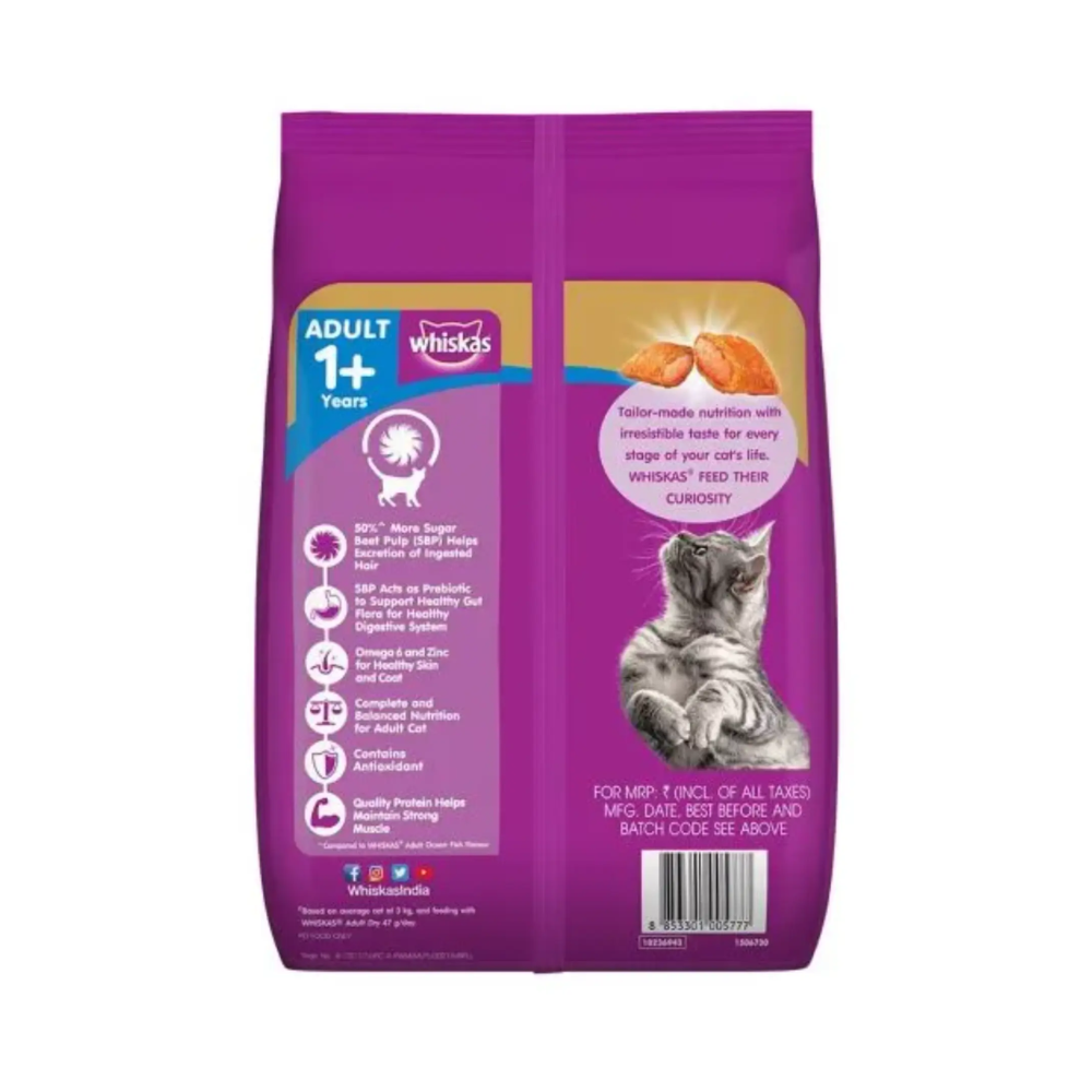 Cats are known for their self-grooming behavior, but this can lead to them swallowing loose hair, causing hairballs. A diet like Whiskas Chicken & Tuna Flavour Hairball Control diet solves this issue by adding natural fibers to assist in the passage of hair through the digestive system. It not only tackles hairballs but also promotes healthy digestion, better nutrient absorption, and maintains strong muscles in cats. The delectable Chicken & Tuna flavor are irresestible food for all cat breeds. Moreover, the diet is enriched with Vitamin E and Taurine, which support improved eyesight and overall immunity. If you’re a cat owner dealing with hairball problems in your felines, Whiskas Chicken & Tuna Hairball Control offers a robust solution to help your cat stay healthy and happy.