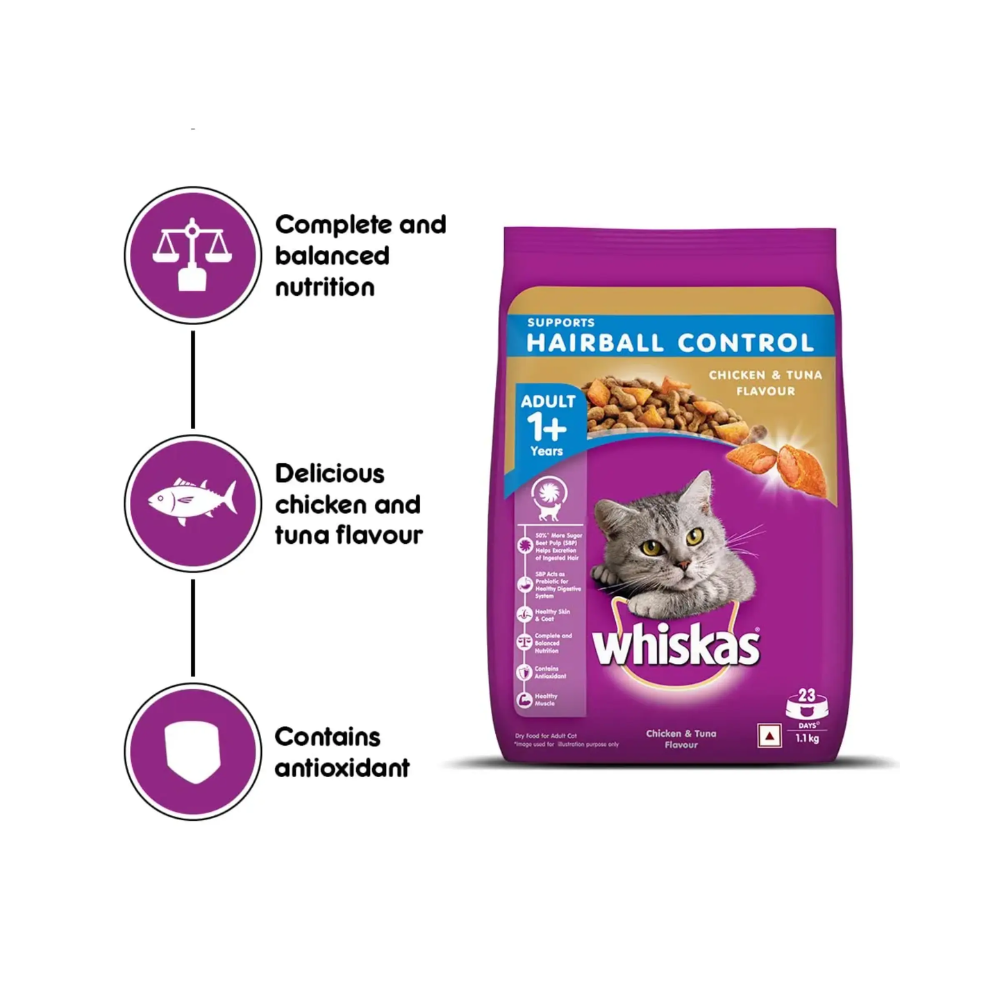 Whiskas Dry Cat Food for Adult Cats Supports Hairball Control Chicken Tuna Flavour